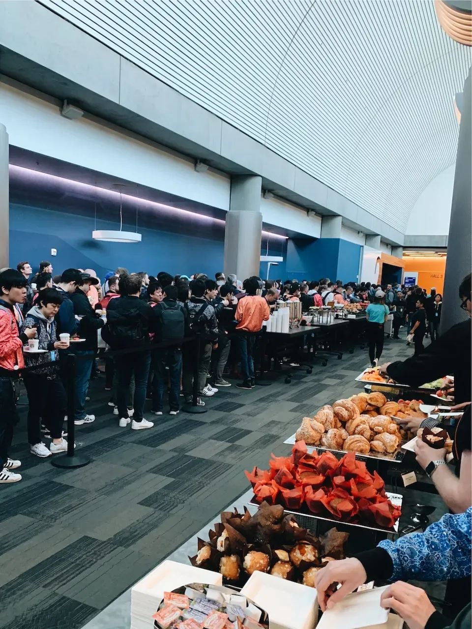 大約在當天早上七時左右,會場便會開放讓開發者進內。Apple 亦安排了果汁和麵包等早餐讓開發者可以拿來填填肚子。不過,進到會場內你還是要排隊,因為這時候舉行 Keynote 的 Hall 內還有準備工作在進行。