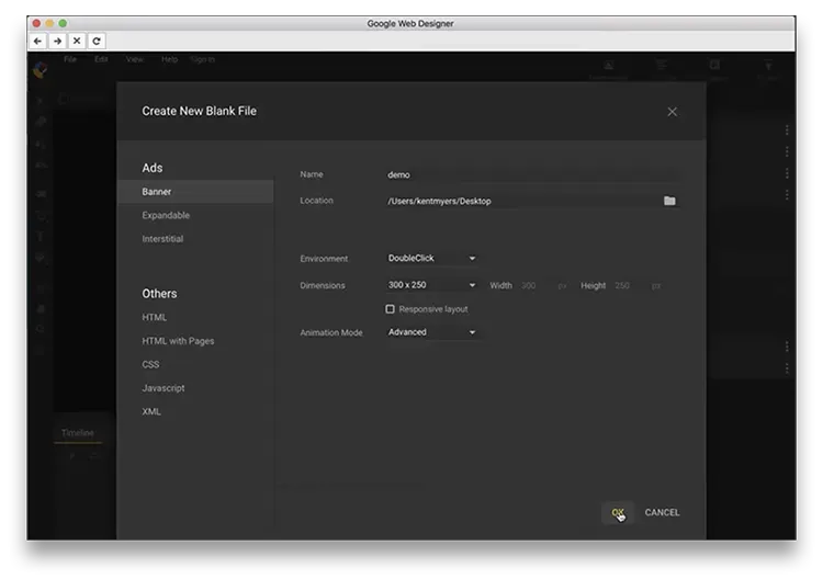 When you create a new blank file in Google Web Designer, choose DoubleClick as your environment.
