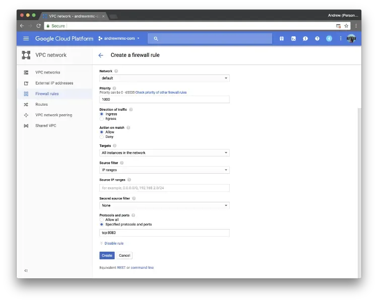 If you are not sure the correct tags name, you can also choose All instances in the network in the options. In Protocols and ports, type tcp:8083 to expose 8083 port to the public.
